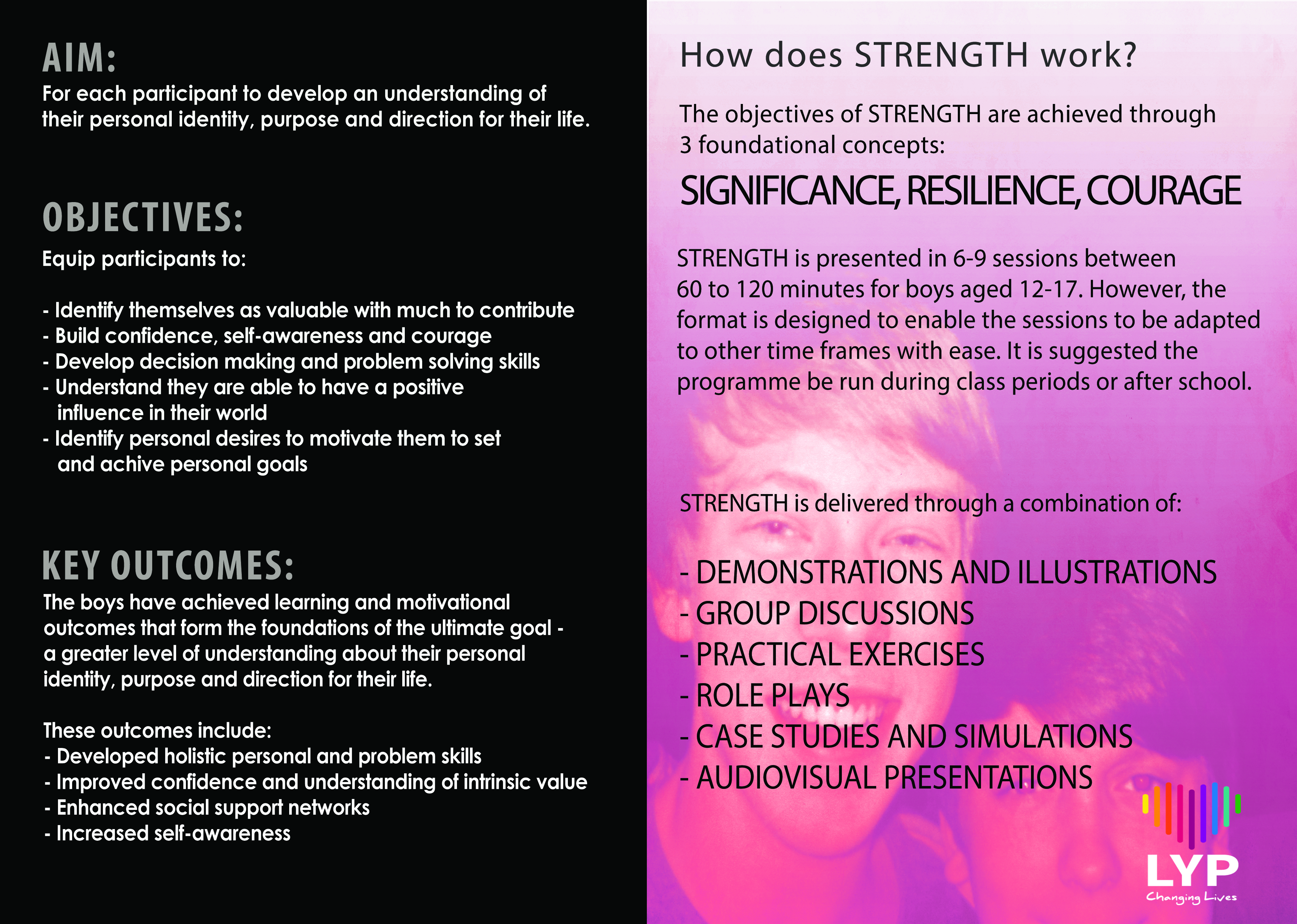 The self-esteem courses are presented in 6-9 sessions between 60 to 120 minutes for boys and girls aged 12-17. However, the format is designed to enable the sessions to be adapted to other time frames with ease. It is suggested the programme be run during class periods or after school.